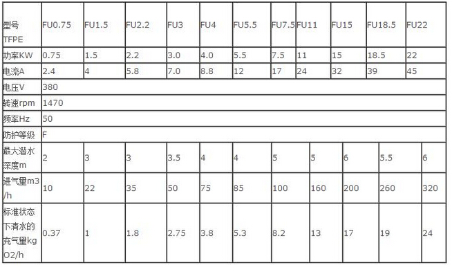 潛水曝氣機用于污水處理廠曝氣池、曝氣沉砂池中,對污水的混合液進行充氧及混合,以及對污水進行生化處理或養(yǎng)殖塘增氧。進氣量為10-320m3/h,增氧能力為0.37-24kgO2/h,電機功率0.75-22kw。